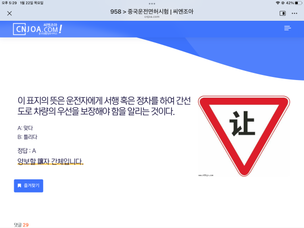 시험문제 오류문의 작성자 정보 Berrymama 작성 작성일 2026.01.22 18:34 컨텐츠 정보 74 조회 1 댓글 목록 본문 이 표지판은 감속 양보하라는 표지판인데 정차가 답이라고 해서요. 이런경우는 그냥 오답을 외워야하나요? 그대로 나올가능성을 두고? 관련자료 이전 면허 시험 보려면 어떤 증명서 필요 한가요? 작성일 2026.02.01 14:00 다음 중국 출장에 필요한 꿀팀 작성일 2025.03.27 20:59 댓글 1 씨엔조아님의 댓글 씨엔조아 작성일 2026.01.28 16:54 중국의 많은 사이트를 찾아 보았는데 답은 "맞다" 입니다. 중국의 많은 사이트를 찾아 보았는데 답은 "맞다" 입니다. 로그인한 회원만 댓글 등록이 가능합니다. 목록